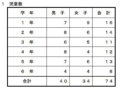| 生徒数(小学校) | 1200人 | 300人 | 105人 | 74人 |